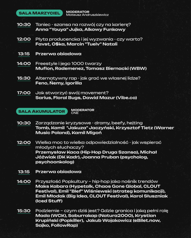 Dj-e, producenci, tancerze, raperzy, managerowie i wiele więcej – wszyscy dyskutujący w pięciu salach o tym, na czym znają się najlepiej. Zapowiada się ciekawy dzień. Pamiętajcie, że wszystkie rozmowy nagramy i opublikujemy na naszym kanale YT.